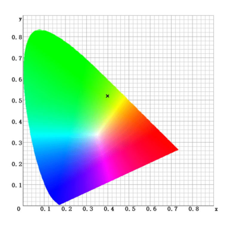 Chromatizität & Luminanzfaktor (wie aufgeführt): B / X / Auf der Seite werden y-Werte für das gut sichtbare gelbe Hintergrundmaterial angezeigt.