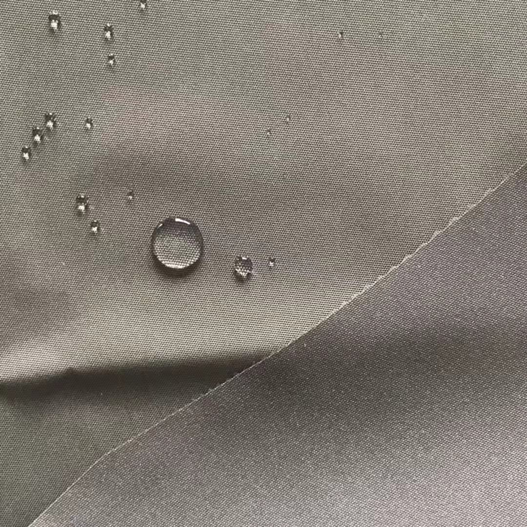 Significa che il tessuto di base è tinto in tinta unita (“tinto in tinta unita”), poi ha concluso con a rivestimento in PU impermeabile per resistenza all'acqua e prestazioni funzionali.